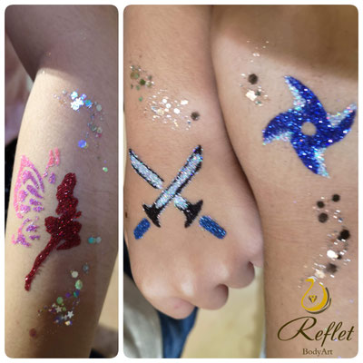 防水ボディグリッターアートは、腕やデコルテ、足首などに医療でも使用されている肌専用のグルーの上にグリッターを施すアートです。ボディジュエリーと同様です。